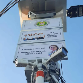 Smart emergency poles featuring CCTV cameras, solar power, emergency button, and digital displays for barangay officials and contact information.